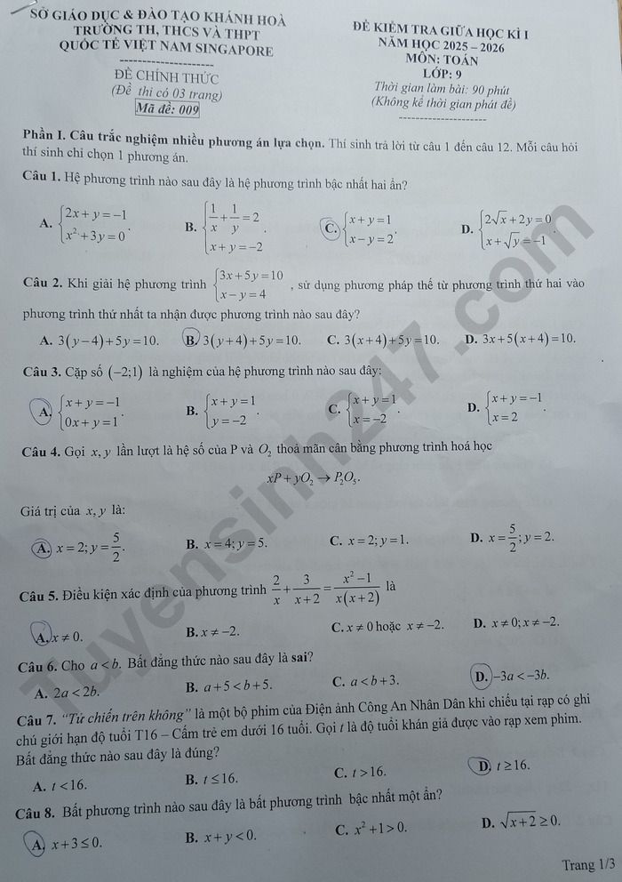 Đề thi giữa kì 1 Toán lớp 9 - TH, THCS và THPT Quốc tế Việt Nam Singapore 2025