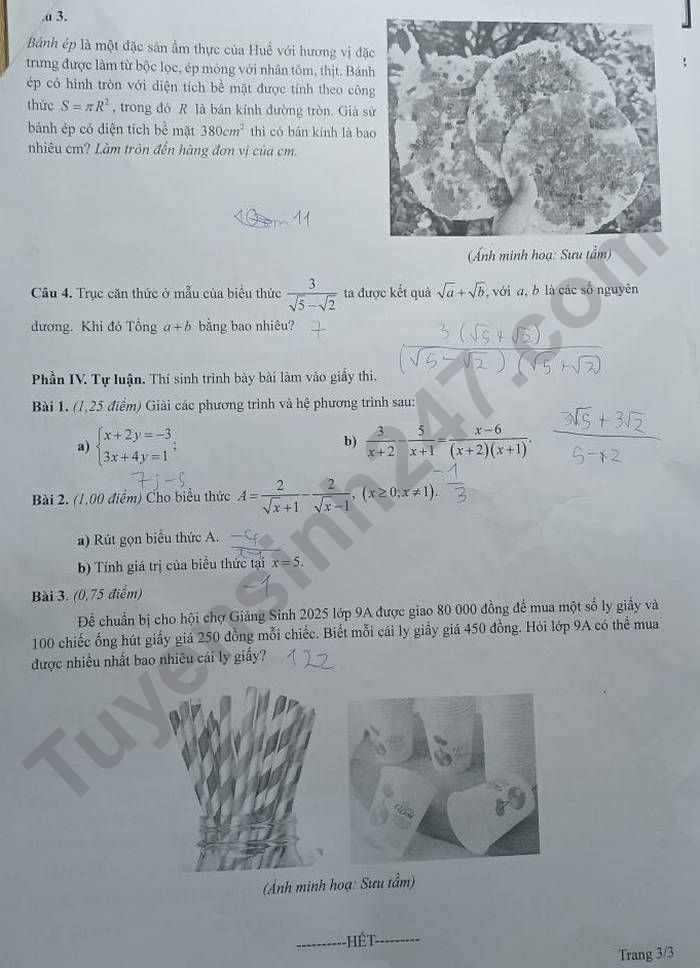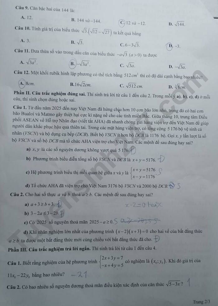 Lưu ý: Đáp án trong đề là bài làm của học sinh, có thể không chính xác