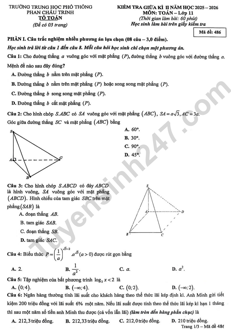 Đề thi giữa kì 2 môn Toán lớp 11 - THPT Phan Châu Trinh