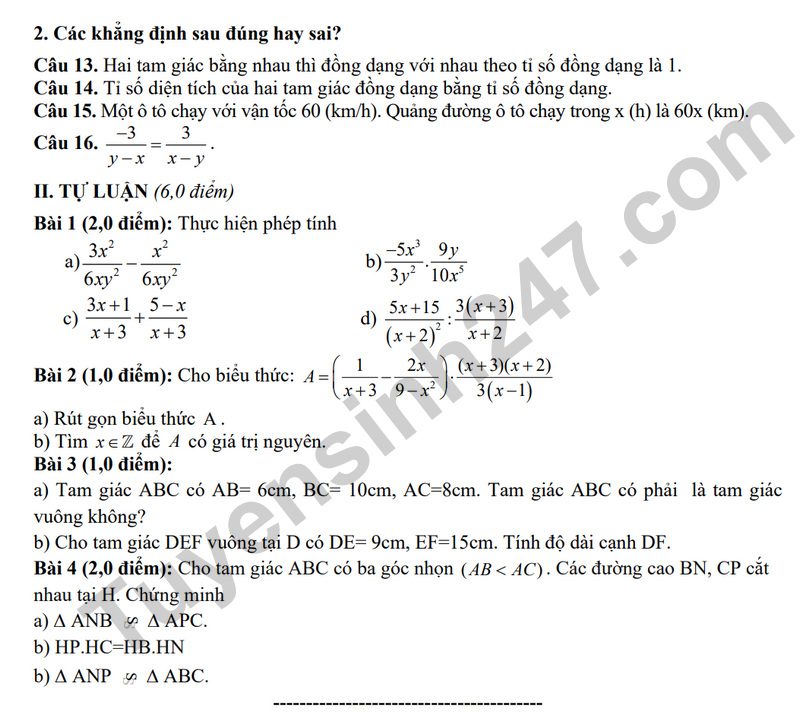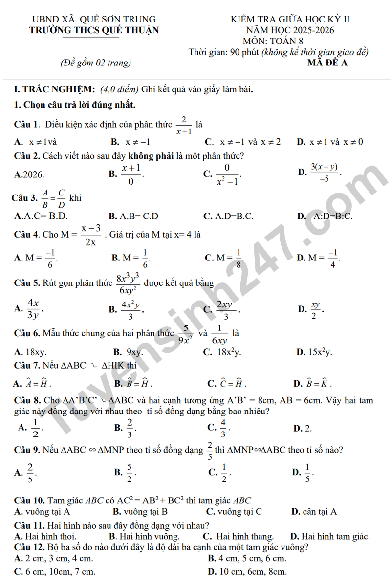Đề thi giữa kỳ 2 Toán 8 năm 2025 – 2026 trường THCS Quế Thuận