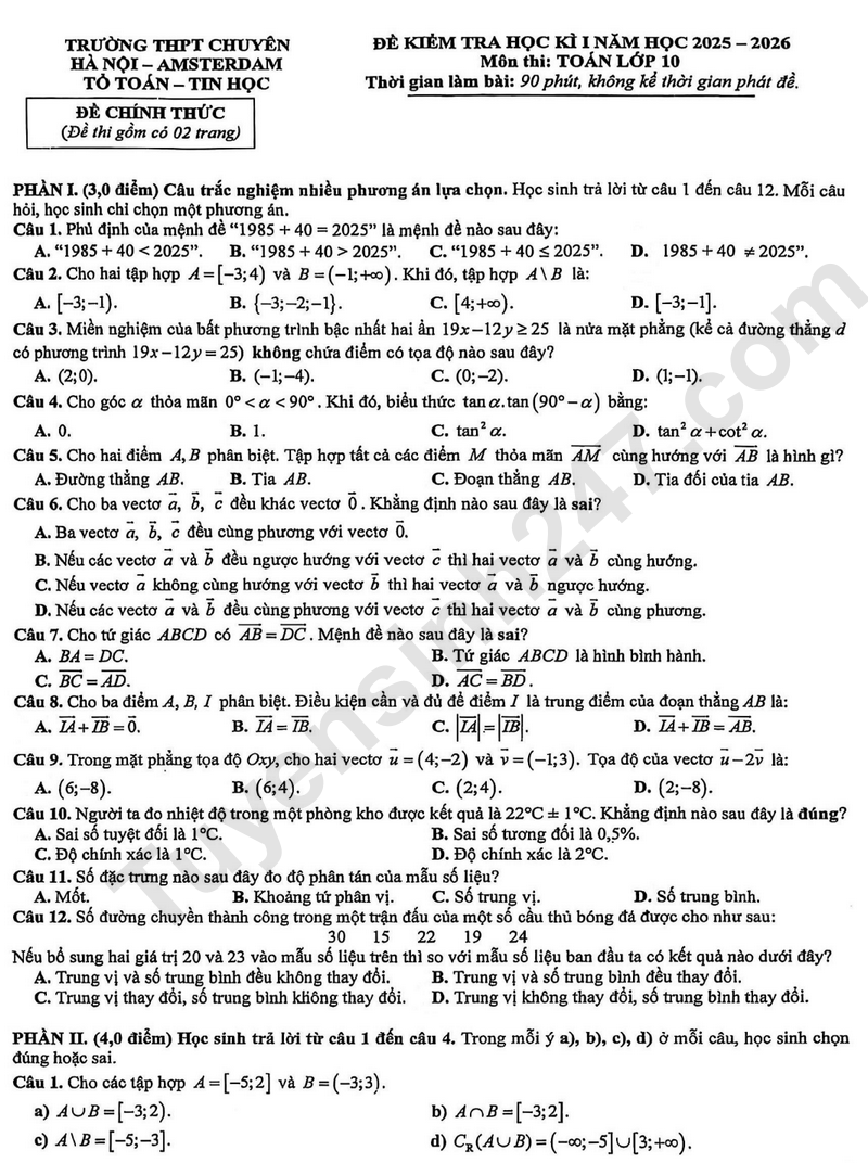 Đề thi HK 1 lớp 10 môn Toán 2025 - THPT Chuyên Amsterdam
