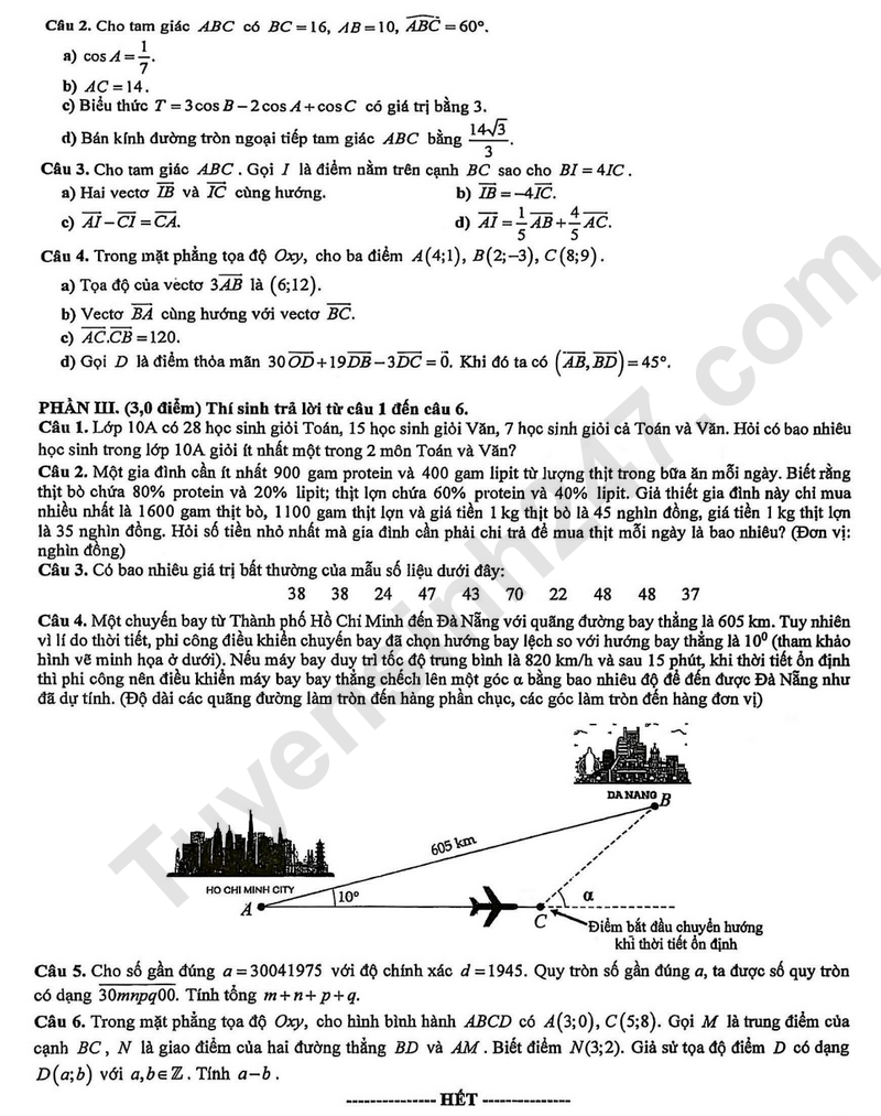 Câu 4. Một chuyến bay từ Thành phố Hồ Chỉ Minh đến Đà Nẵng với quãng đường bay thẳng là 605 km. Tuy nhiên vì lí do thời tiết, phỉ công điều khiển chuyến bay đã chọn hướng bay lệch so với hướng bay thẳng là 10º (tham khảo hình vẽ minh họa ở dưới). Nếu máy bay duy trì tốc độ trung bình là 820 km/h và sau 15 phút, khi thời tiết ổn định thì phi công nên điều khiển máy bay bay thẳng chếch lên một góc a bằng bao nhiêu độ để đến được Đà Nẵng như đã dự tính. (Độ dài các quãng đường làm tròn đến hàng phần chục, các góc làm tròn đến hàng đơn vị)