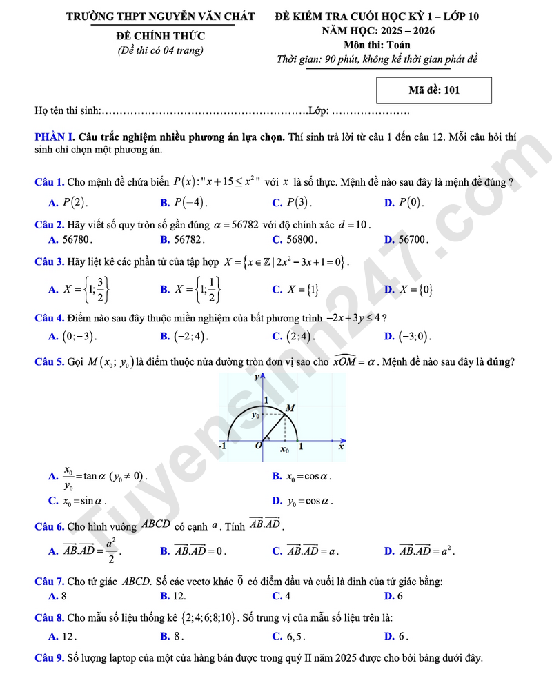 Đề thi HK 1 lớp 10 môn Toán 2025 - THPT Nguyễn Văn Chất