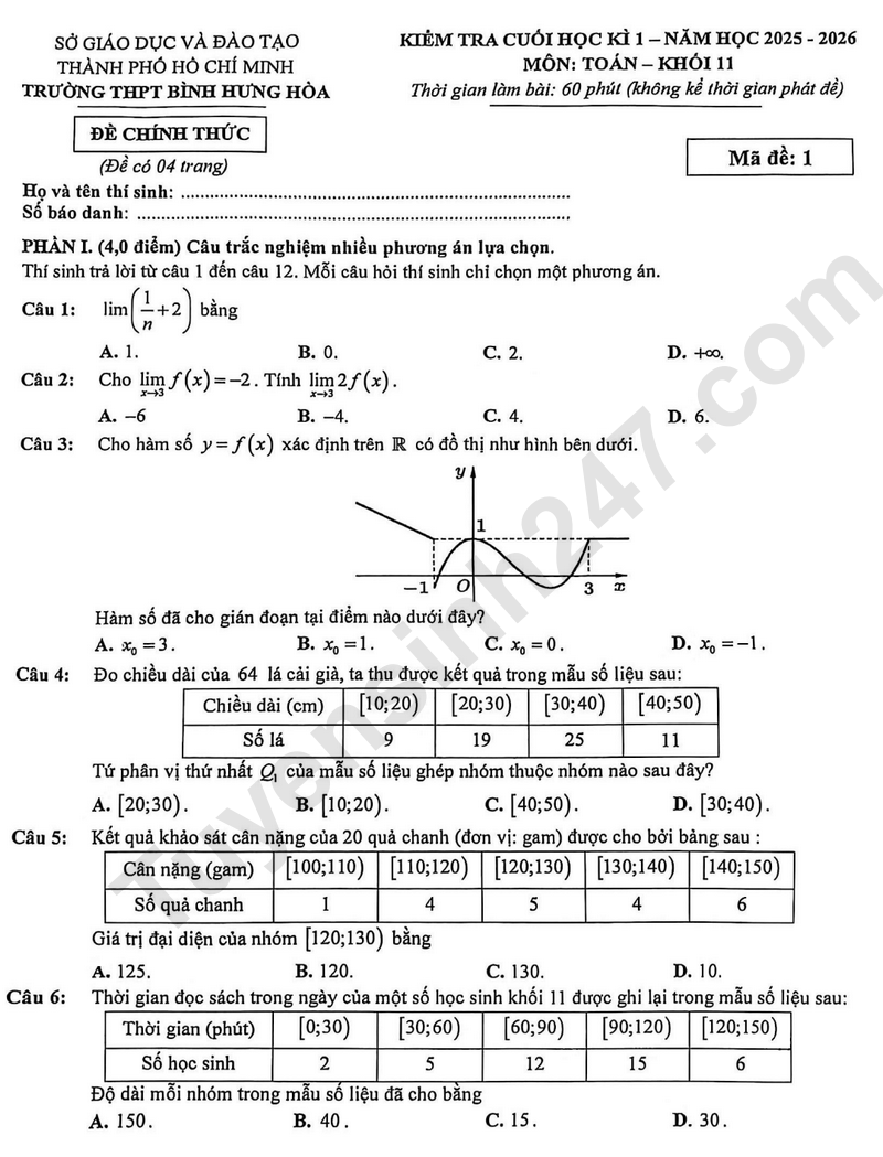 Đề thi HK 1 lớp 11 môn Toán 2025 - THPT Bình Hưng Hòa
