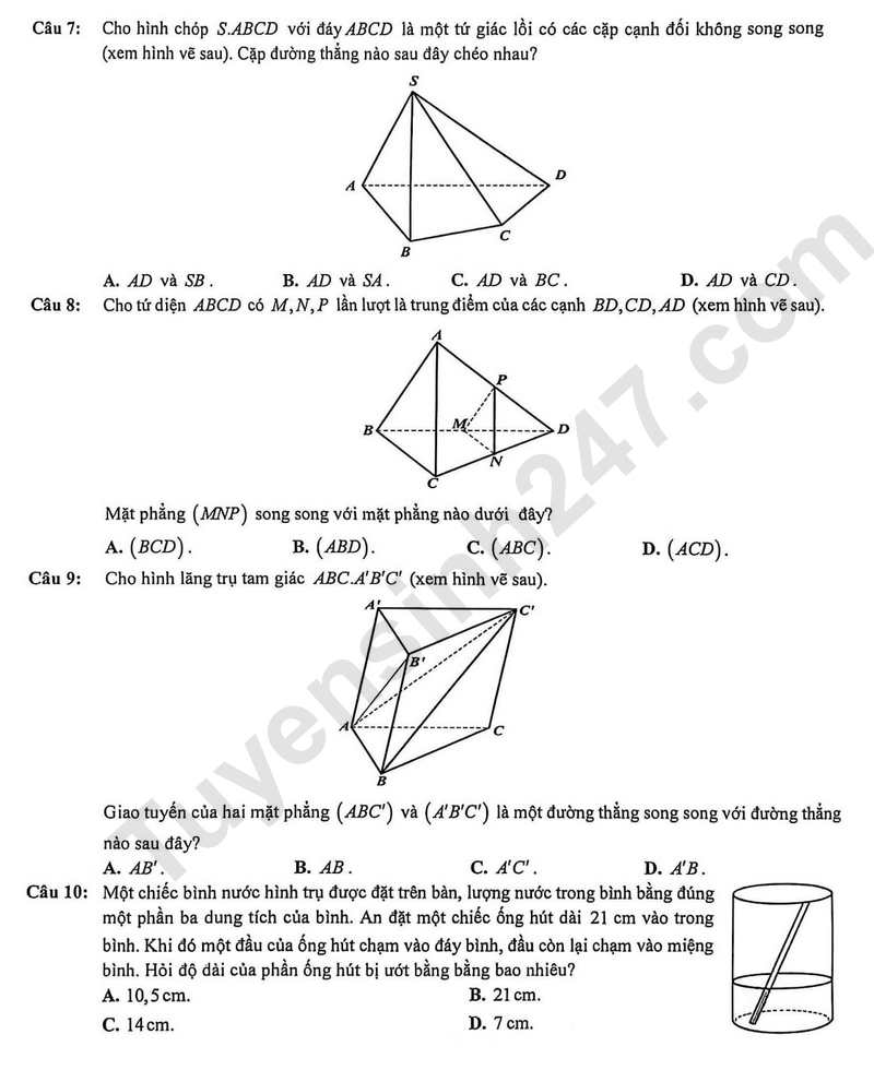 Câu 10: Một chiếc bình nước hình trụ được đặt trên bàn, lượng nước trong bình bằng đúng một phần ba dung tích của bình. An đặt một chiếc ống hút dài 21 cm vào trong bình. Khi đó một đầu của ống hút chạm vào đáy bình, đầu còn lại chạm vào miệng bình. Hỏi độ đài của phần ống hút bị ướt bằng bằng bao nhiêu?