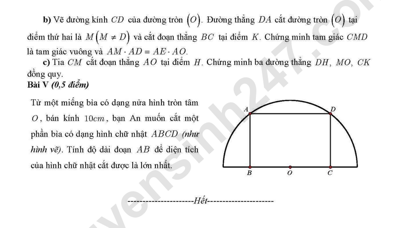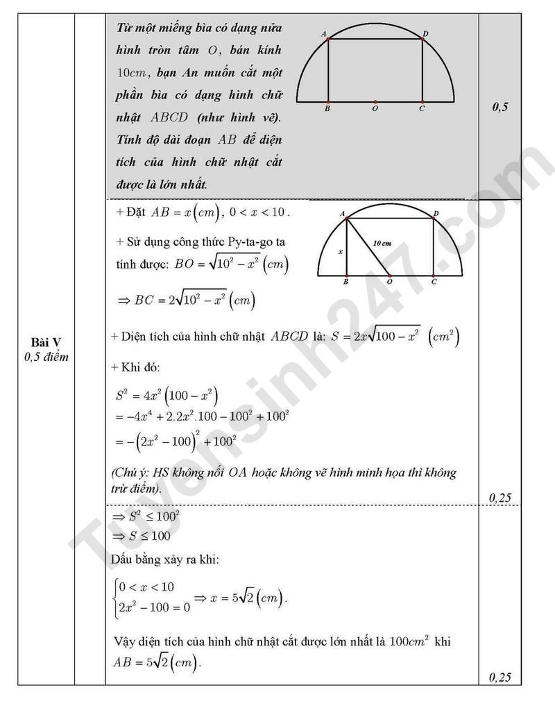 Từ một miếng bìa có dạng nửa hình tròn tâm O, bán kính 10cm, bạn An muốn cắt một phần bìa có dạng hình chữ nhật ABCD (như hình vẽ). Tính độ dài đoạn AB để diện tích của hình chữ nhật cắt được là lớn nhất.