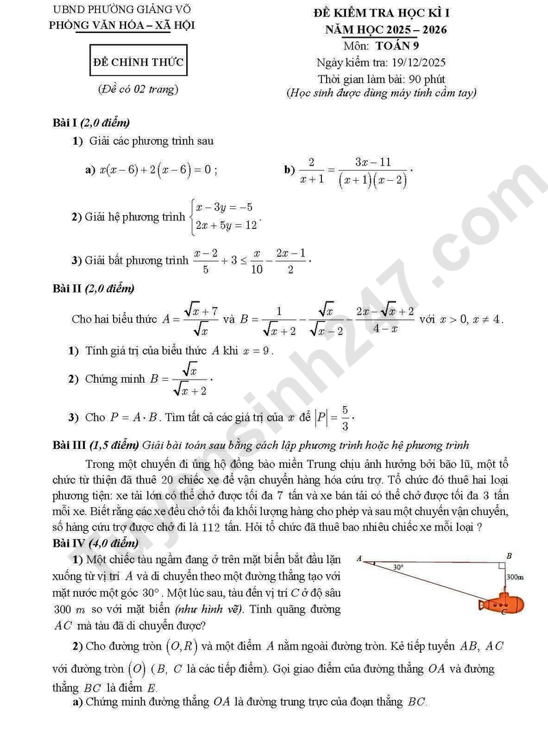 Đề thi HK 1 lớp 9 môn Toán 2025 - Phường Giảng Võ