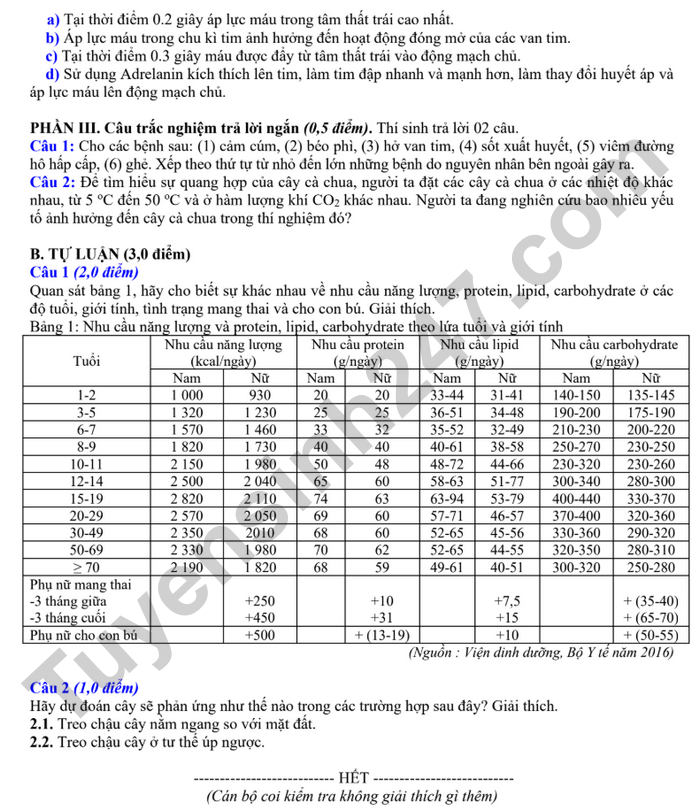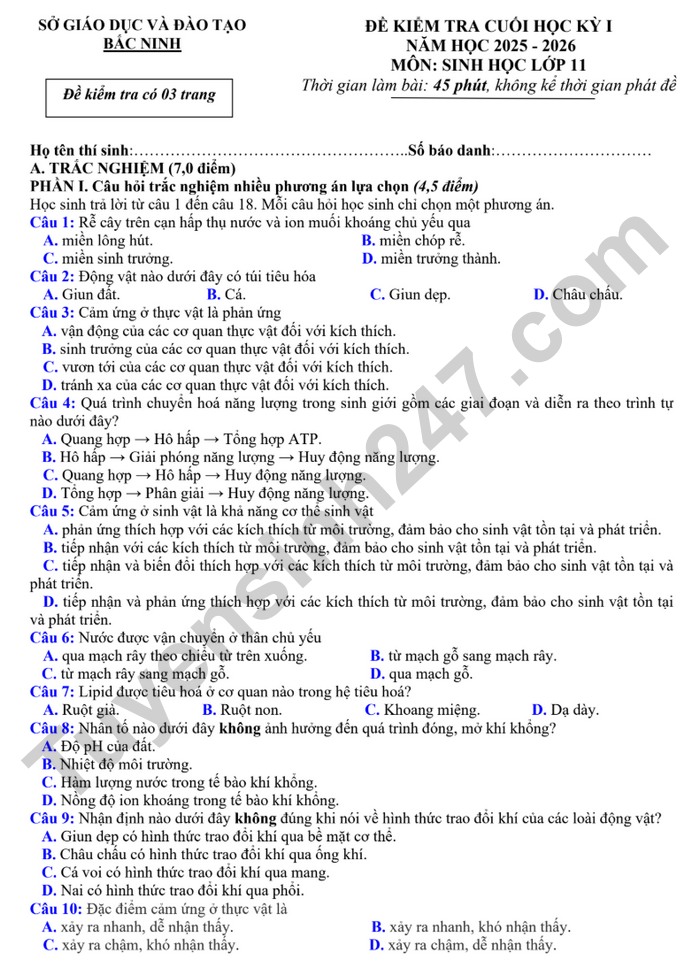 Đề thi HK1 lớp 11 môn Sinh - Sở GD Bắc Ninh 2025