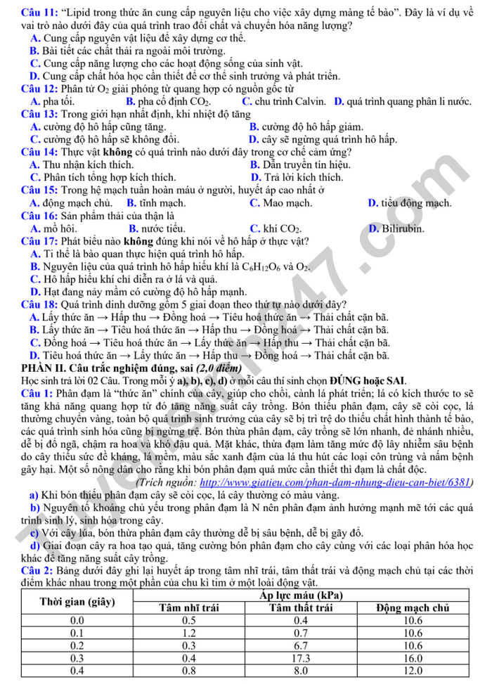 Câu 18: Quá trình dinh dưỡng gồm 5 giai đoạn theo thứ tự nào dưới đây?