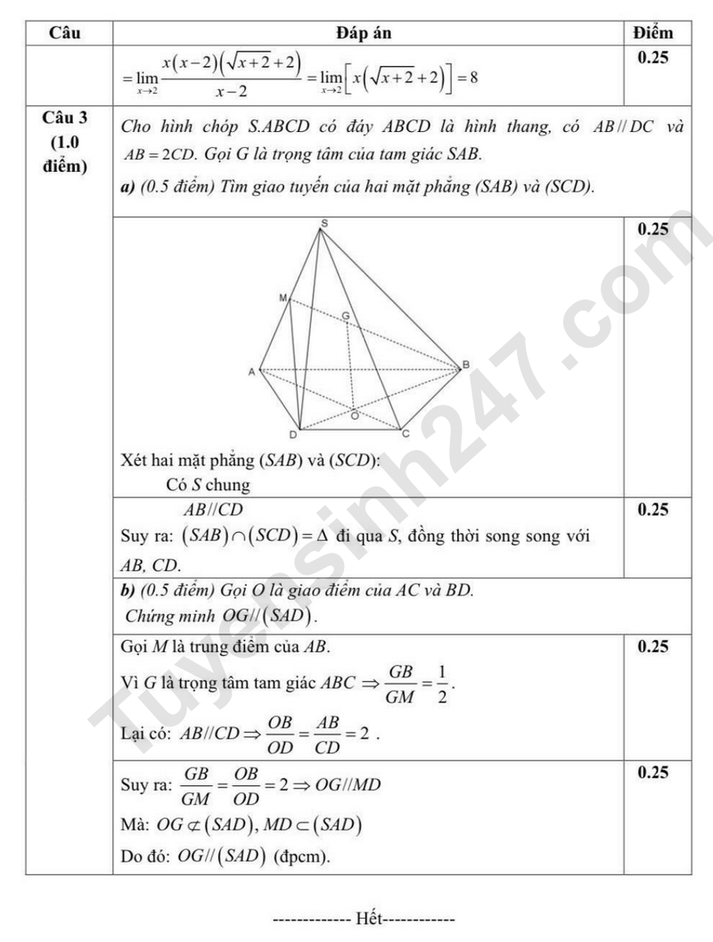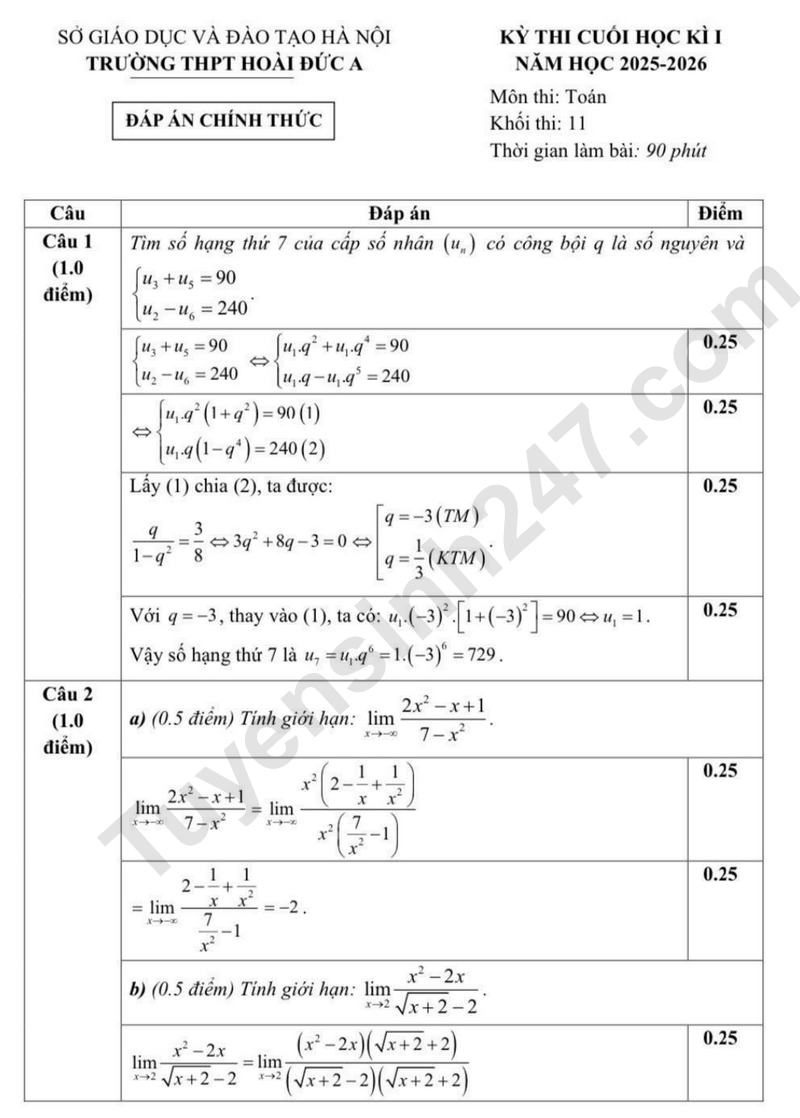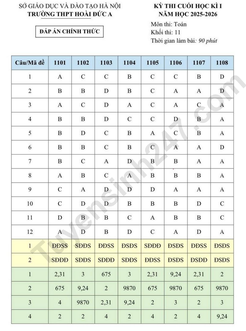 Đáp án đề thi HK1 năm 2025 môn Toán lớp 12 - THPT Hoài Đức A