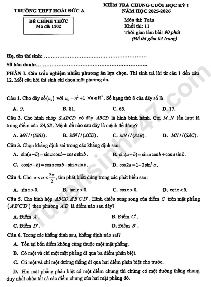 Đề thi HK1 năm 2025 môn Toán lớp 12 - THPT Hoài Đức A