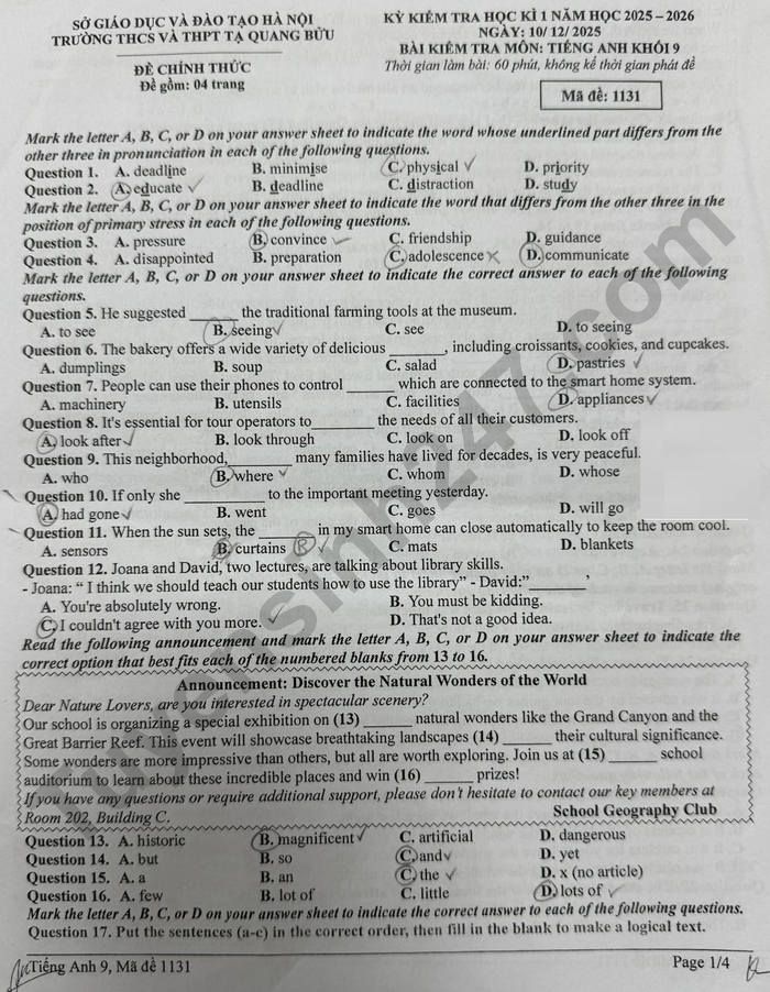 Đề thi học kì 1 Anh 9 THCS&THPT Tạ Quang Bửu 2025