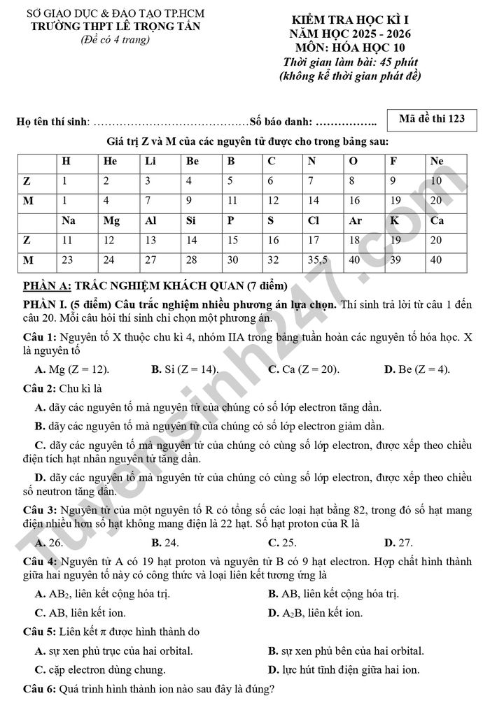 Đề thi học kì 1 Hóa lớp 10 THPT Lê Trọng Tấn 2025