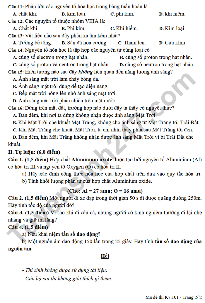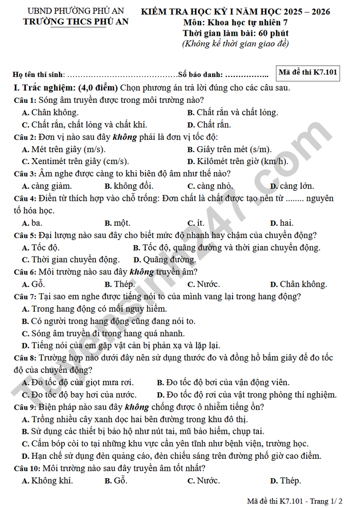Đề thi học kì 1 KHTN lớp 7 THCS Phú An 2025