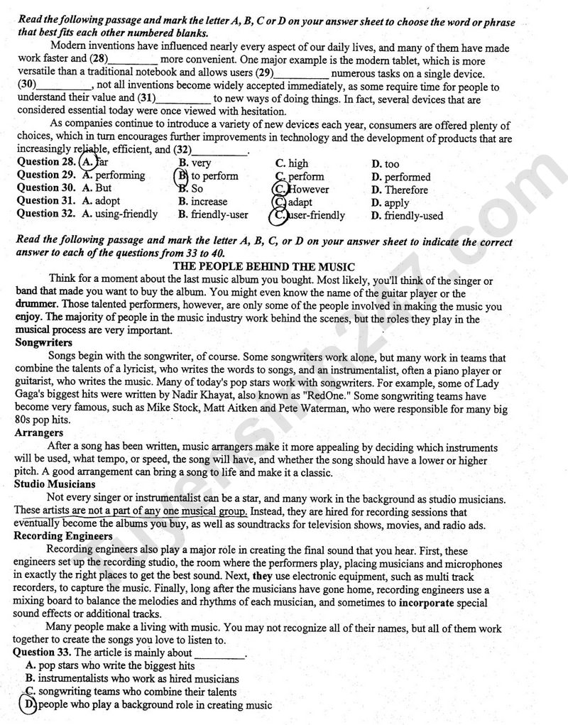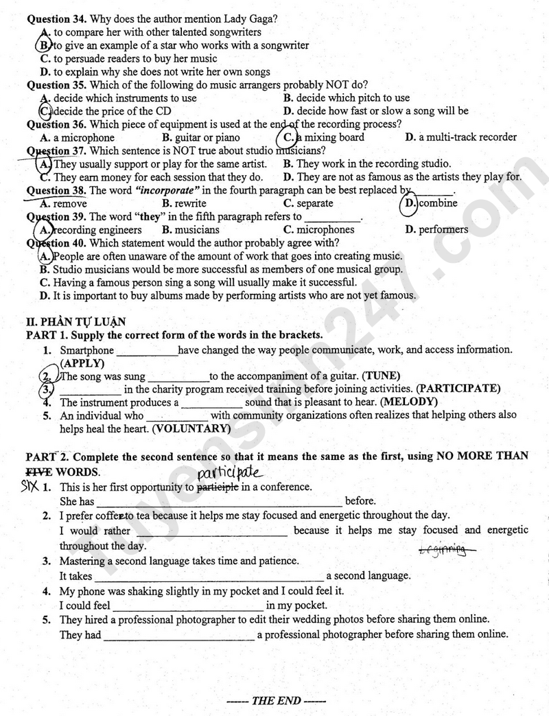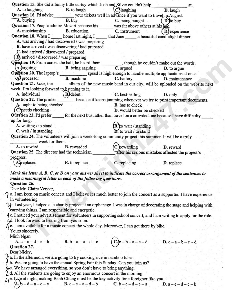 Lưu ý: Đáp án trong đề thi là của học sinh, có thể không chính xác