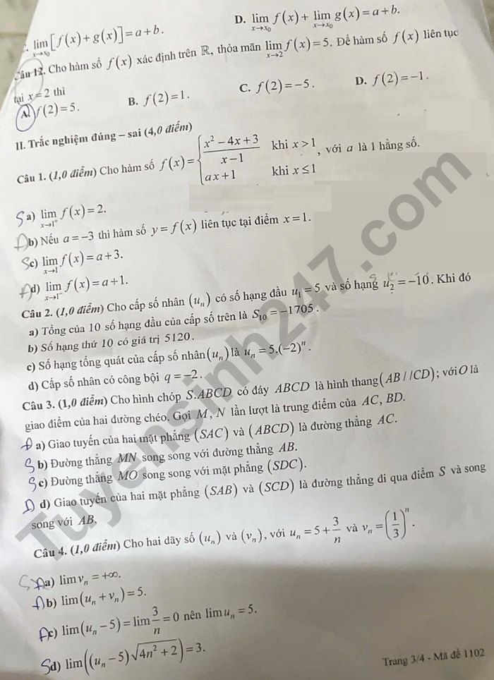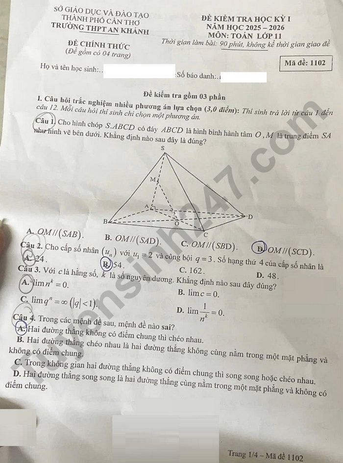 Lưu ý: Đáp án trong đề là bài làm của học sinh, có thể không chính xác