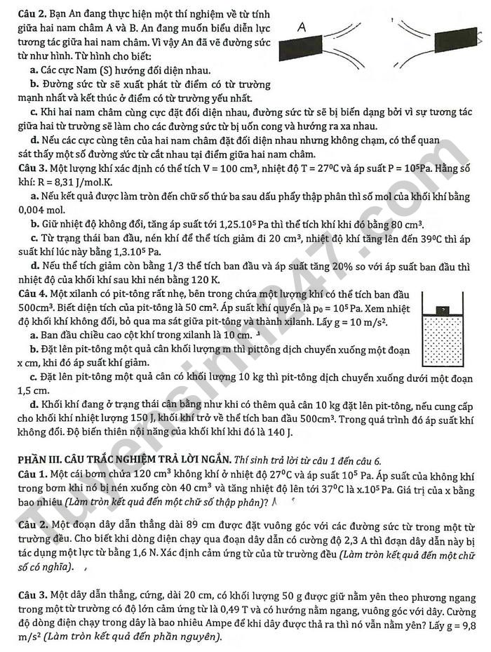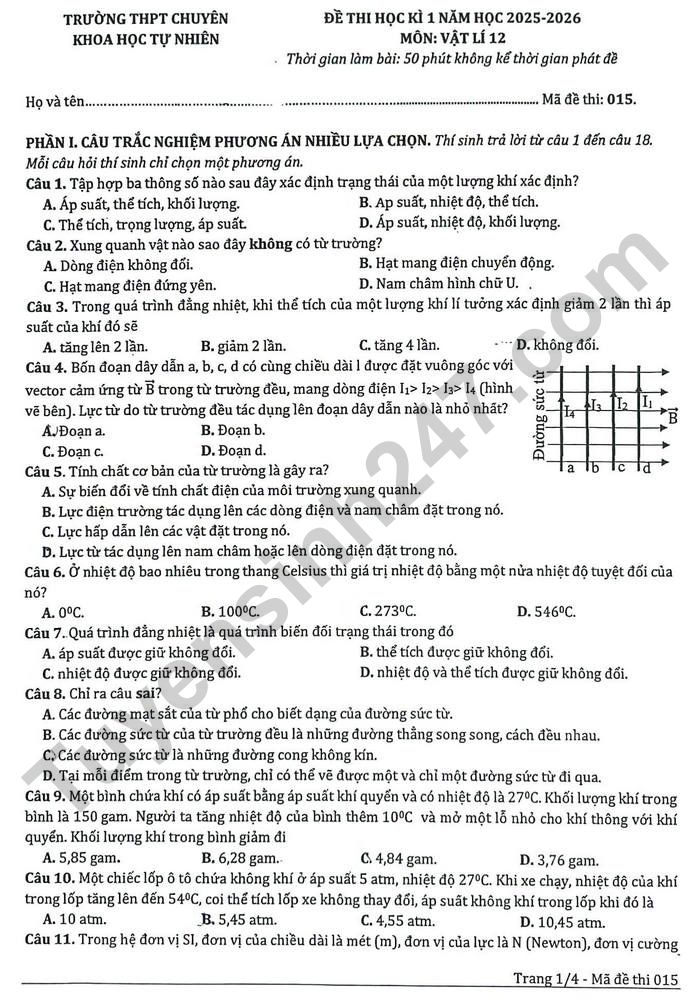 Đề thi học kì 1 lớp 12 môn Lý - THPT Chuyên khoa học tự nhiên 2025
