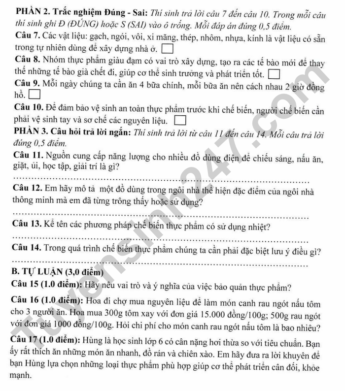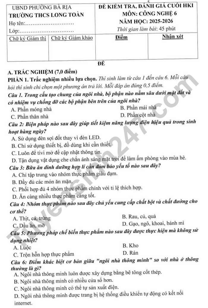 Đề thi học kì 1 lớp 6 môn Công nghệ 2025 - THCS Long Toàn