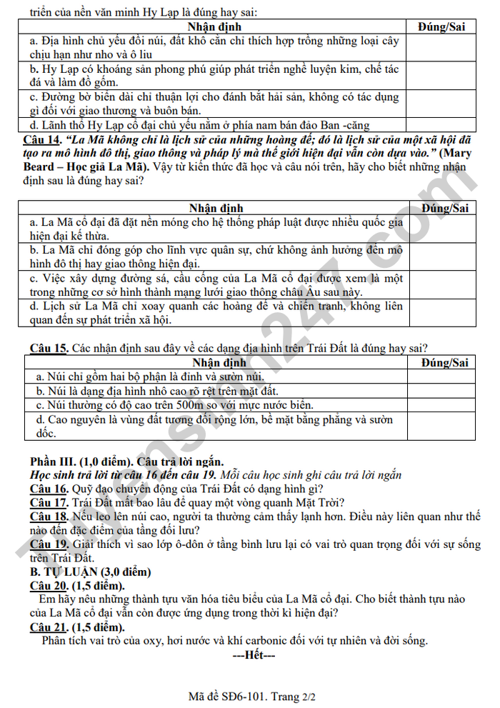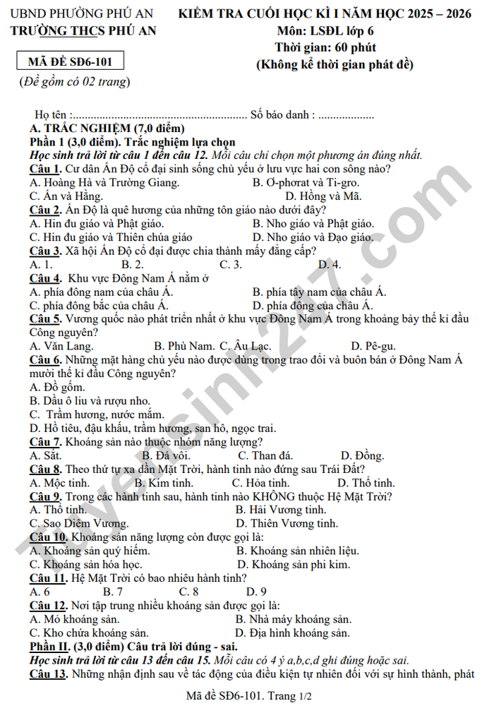 Đề thi học kì 1 lớp 6 môn Sử-Địa 2025 - THCS Phú An