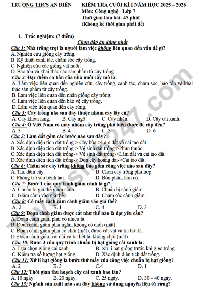 Đề thi học kì 1 lớp 7 Công nghệ 2025 - THCS An Điền