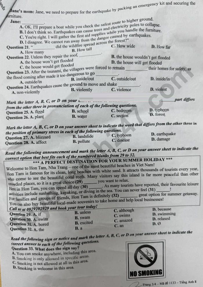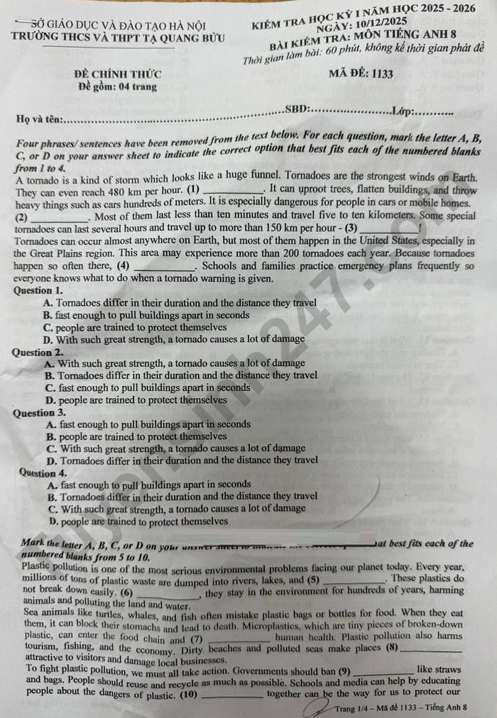 Đề thi học kì 1 lớp 8 môn Anh 2025 - THCS và THPT Tạ Quang Bửu