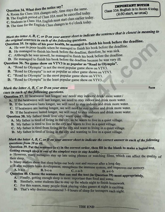 Question 39. Put the sentence (a-c) in the correct order, then fill in the blank to make a logical text. Getting enough sleep is one of the simplest ways to stay healthy.