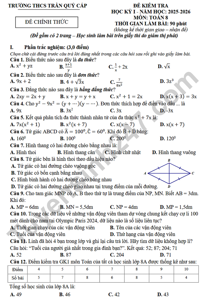 Đề thi học kì 1 lớp 8 môn Toán 2025 - THCS Trần Quý Cáp