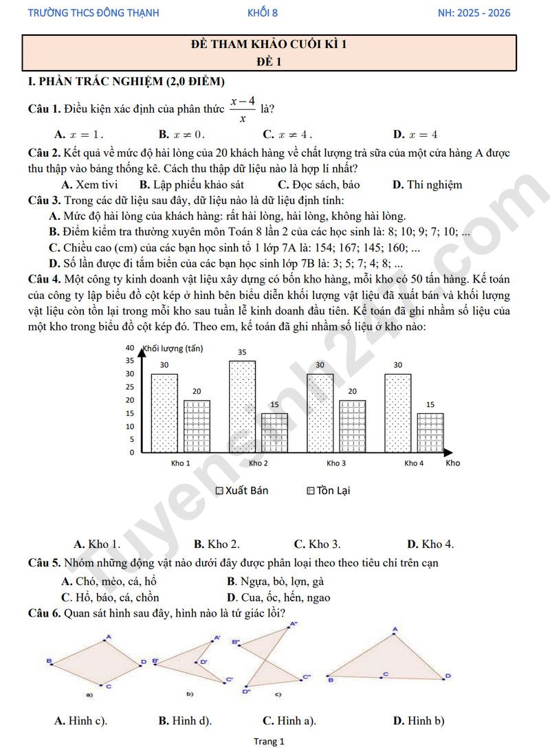 Đề thi học kì 1 lớp 8 môn Toán 2025 - trường THCS Đông Thạnh (Tham khảo)