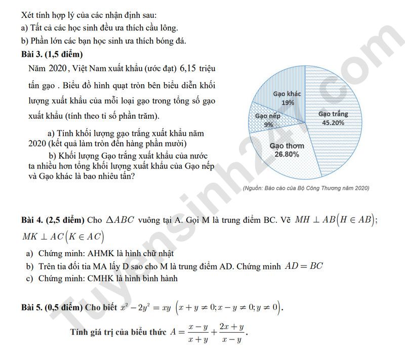 Bài 3. (1,5 điểm) Năm 2020, Việt Nam xuất khẩu (ước đạt) 6,15 triệu tấn gạo . Biểu đồ hình quạt tròn bên biểu diễn khối lượng xuất khẩu của mỗi loại gạo trong tổng số gạo xuất khẩu (tính theo tỉ số phần trăm).