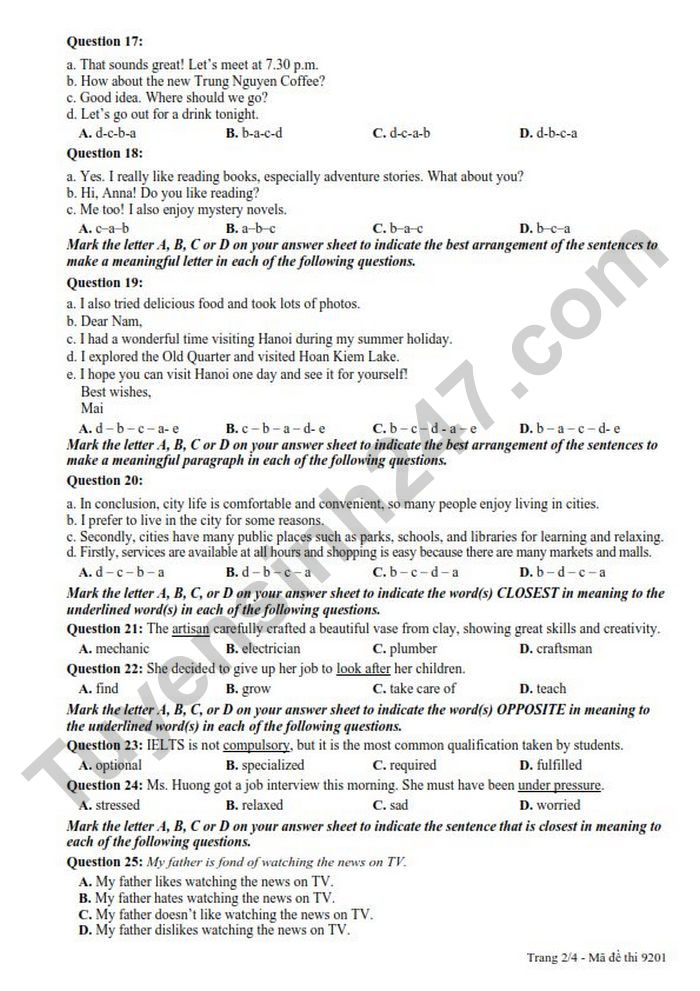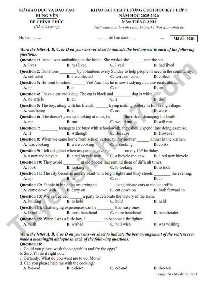 Đề thi học kì 1 lớp 9 môn Anh 2025 - Sở GDĐT Hưng Yên