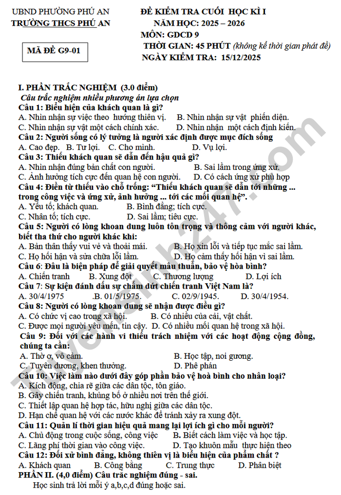 Đề thi học kì 1 lớp 9 môn GDCD 2025 - THCS Phú An (Có đáp án)