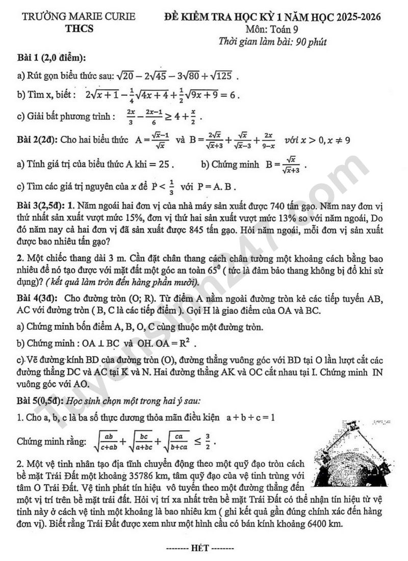 Đề thi học kì 1 lớp 9 môn Toán 2025 - THCS Marie Curie