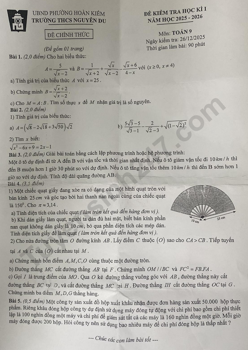 Đề thi học kì 1 lớp 9 môn Toán 2025 - THCS Nguyễn Du