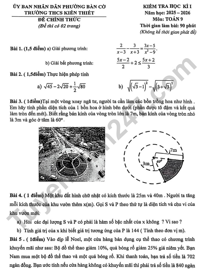 Đề thi học kì 1 lớp 9 môn Toán THCS Kiến Thiết 2025