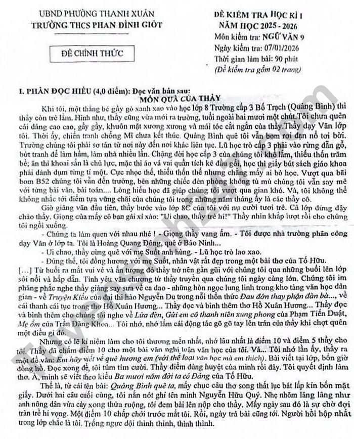 Đề thi học kì 1 lớp 9 môn Văn 2025 - THCS Phan Đình Giót