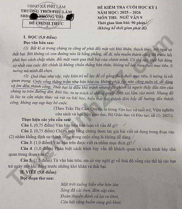 Đề thi học kì 1 lớp 9 môn Văn 2025 - THCS Phú Lâm