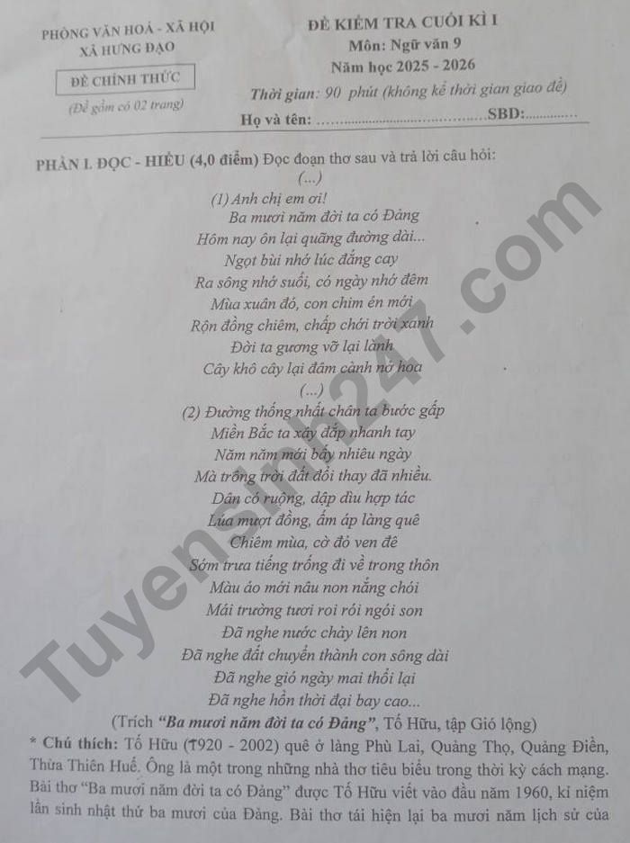Đề thi học kì 1 lớp 9 môn Văn 2025 - xã Hưng Đạo