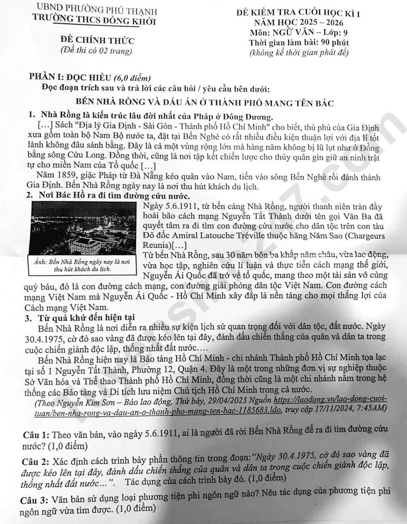 Đề thi học kì 1 lớp 9 môn Văn năm 2025 - THCS Đồng Khởi