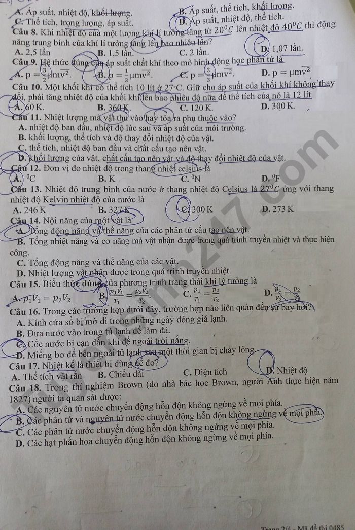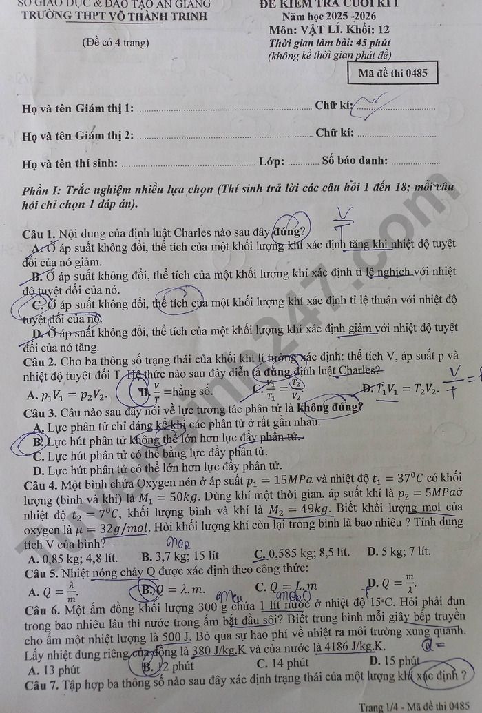 Lưu ý: Đáp án trong đề là bài làm của học sinh, có thể không chính xác