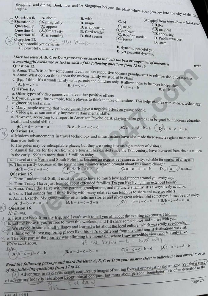 Lưu ý: Đáp án trong đề là bài làm của học sinh, có thể không chính xác