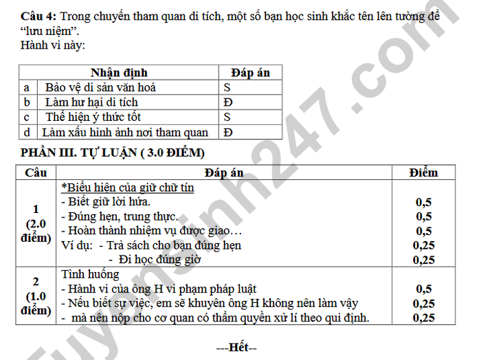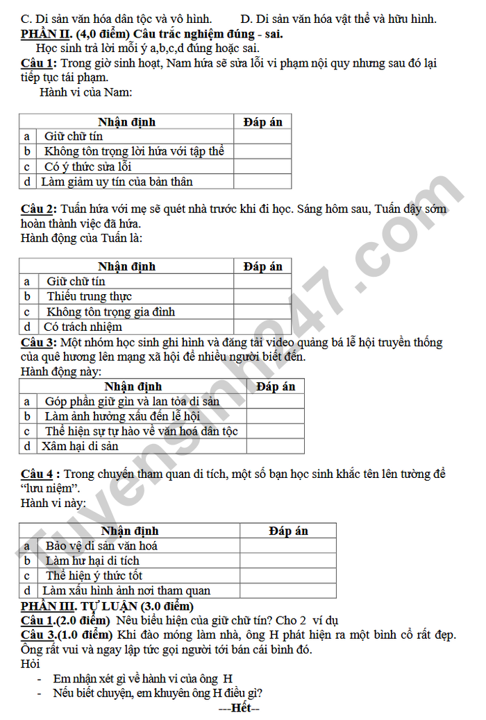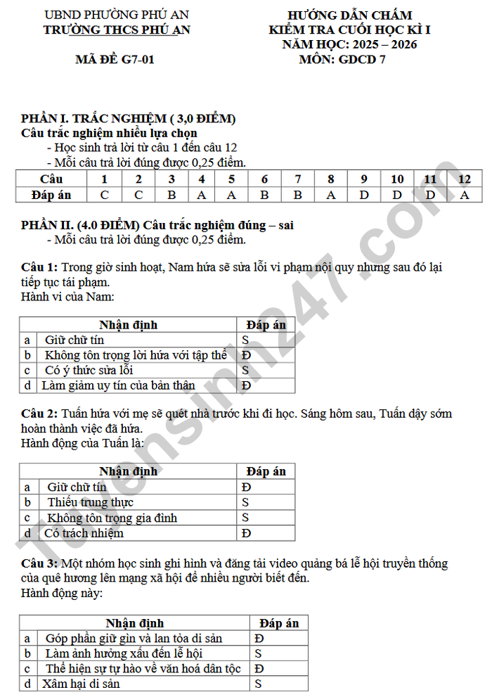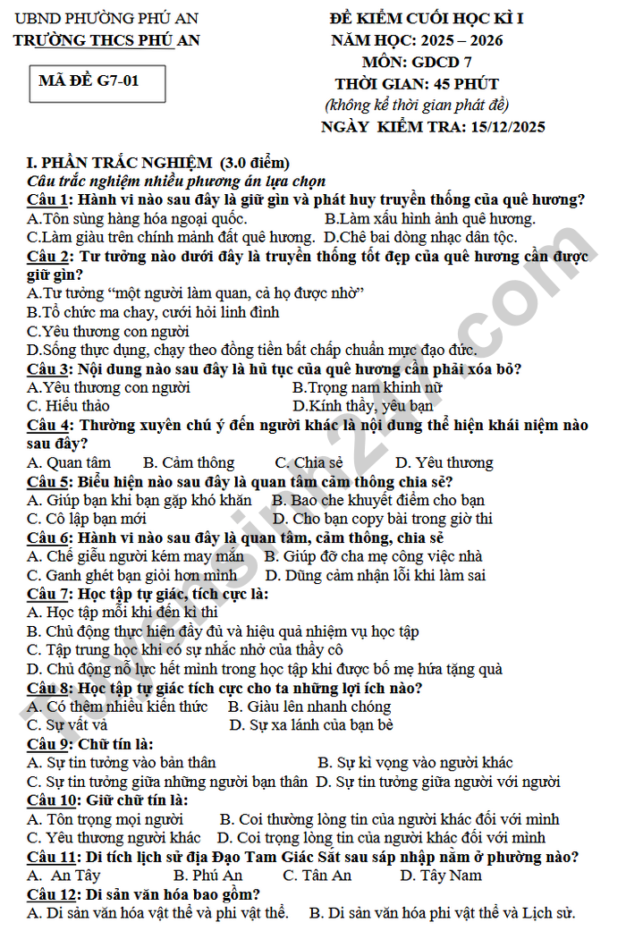 Đề thi học kì 1 môn GDCD lớp 7 THPT Phú An 2025