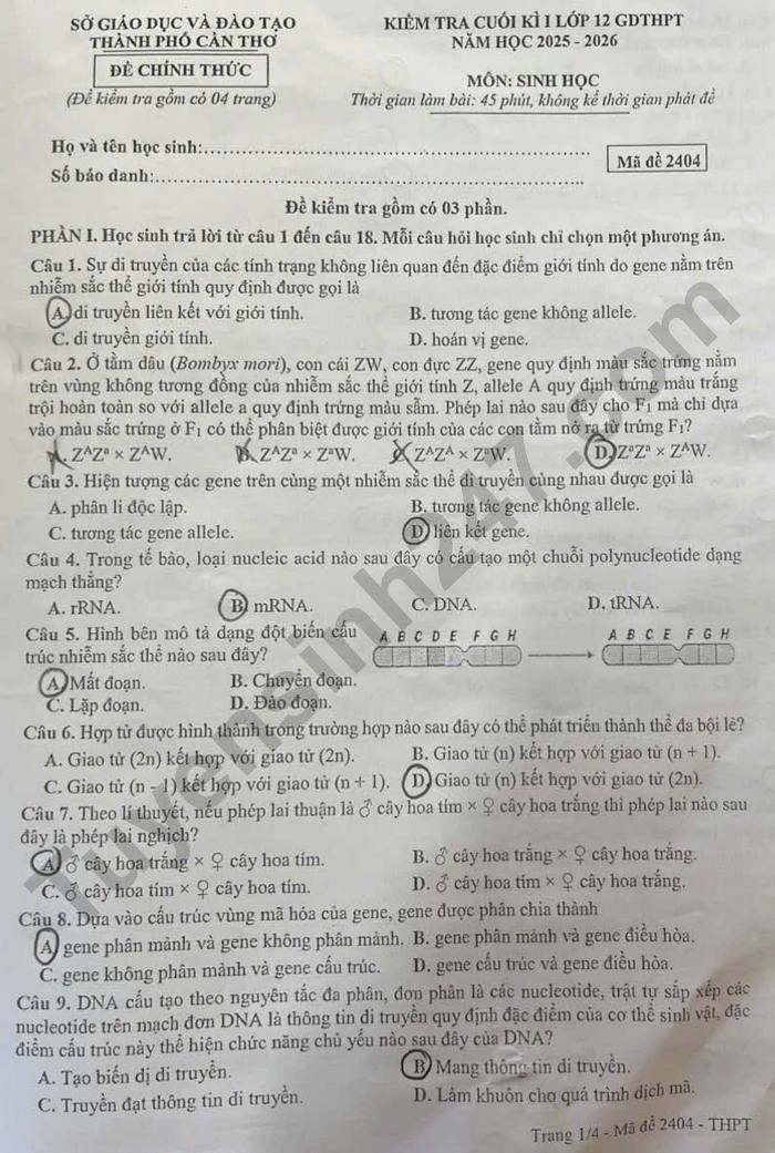 Đề thi học kì 1 môn Sinh 12 TP Cần Thơ 2025