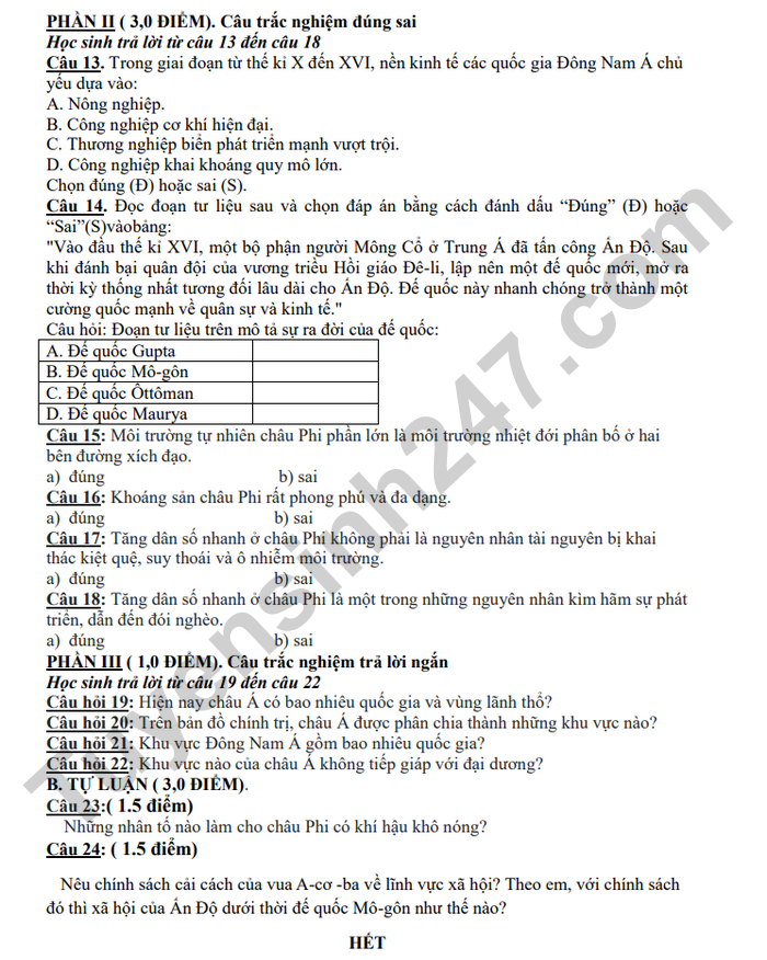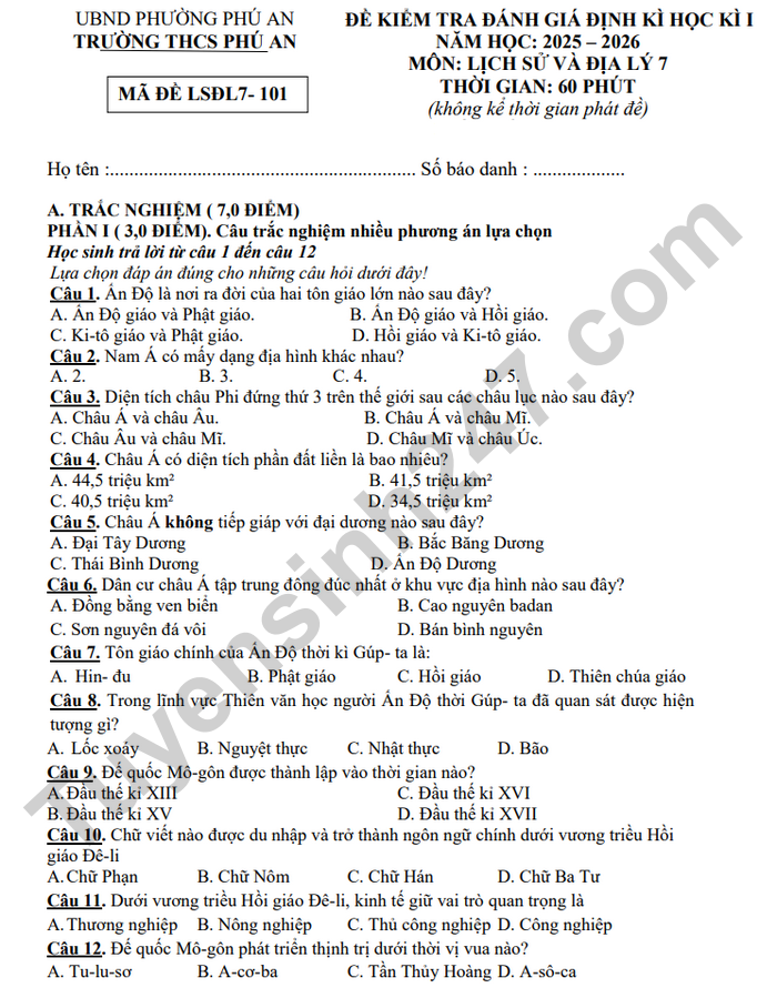 Đề thi học kì 1 môn Sử-Địa lớp 7 THCS Phú An 2025