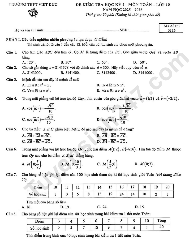 Đề thi học kì 1 môn Toán lớp 10 năm 2025 - THPT Việt Đức