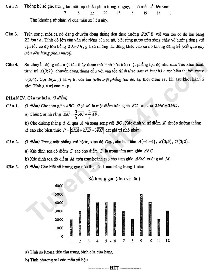 Câu 4. Sự chuyển động của một tàu thủy được mô hình hóa trên mặt phẳng tọa độ như sau: Tâu khởi hành từ vị trí A(3;2), chuyển động thẳng đều với vận tốc (lính theo đơn vị km/ h) được biểu thị bởi vecto v(3;4). Gọi B(x;y) là vị trí của tàu (trên mặt phẳng tọa độ) tại thời điểm sau khi tàu khởi hành giờ. Tính giá trị của x.y.