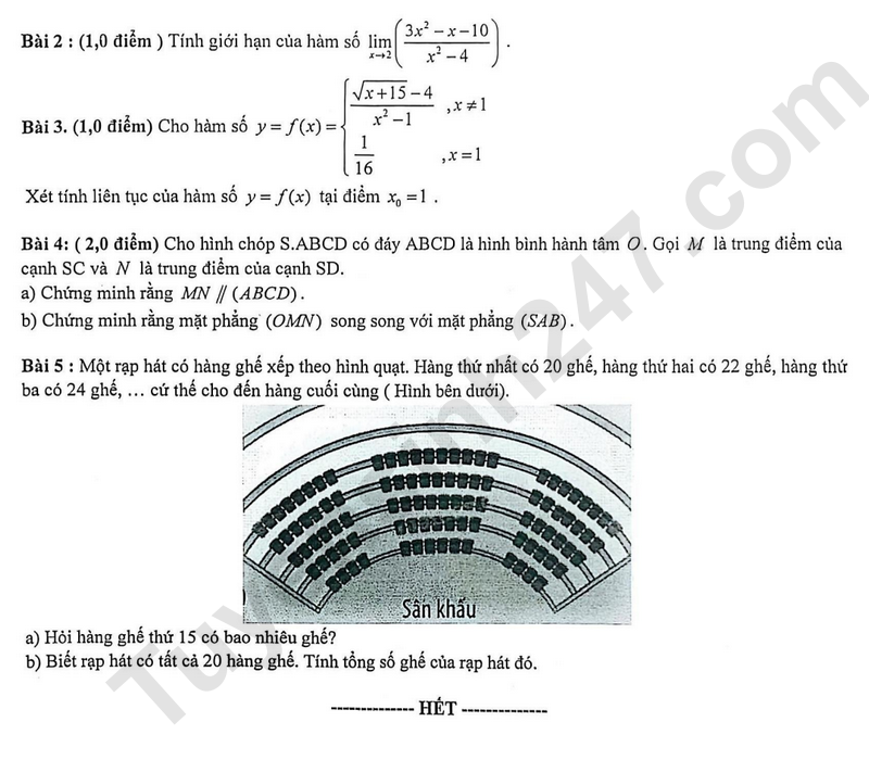 Câu 11. Một rạp hát có 20 hàng ghế xếp theo hình quạt. Hàng thứ nhất có 17 ghế, hàng thứ hai có 20 ghế, hàng thứ ba có 23 ghế,... cứ thế tiếp tục cho đến hàng cuối cùng. Tính tổng số ghế có trong rạp.