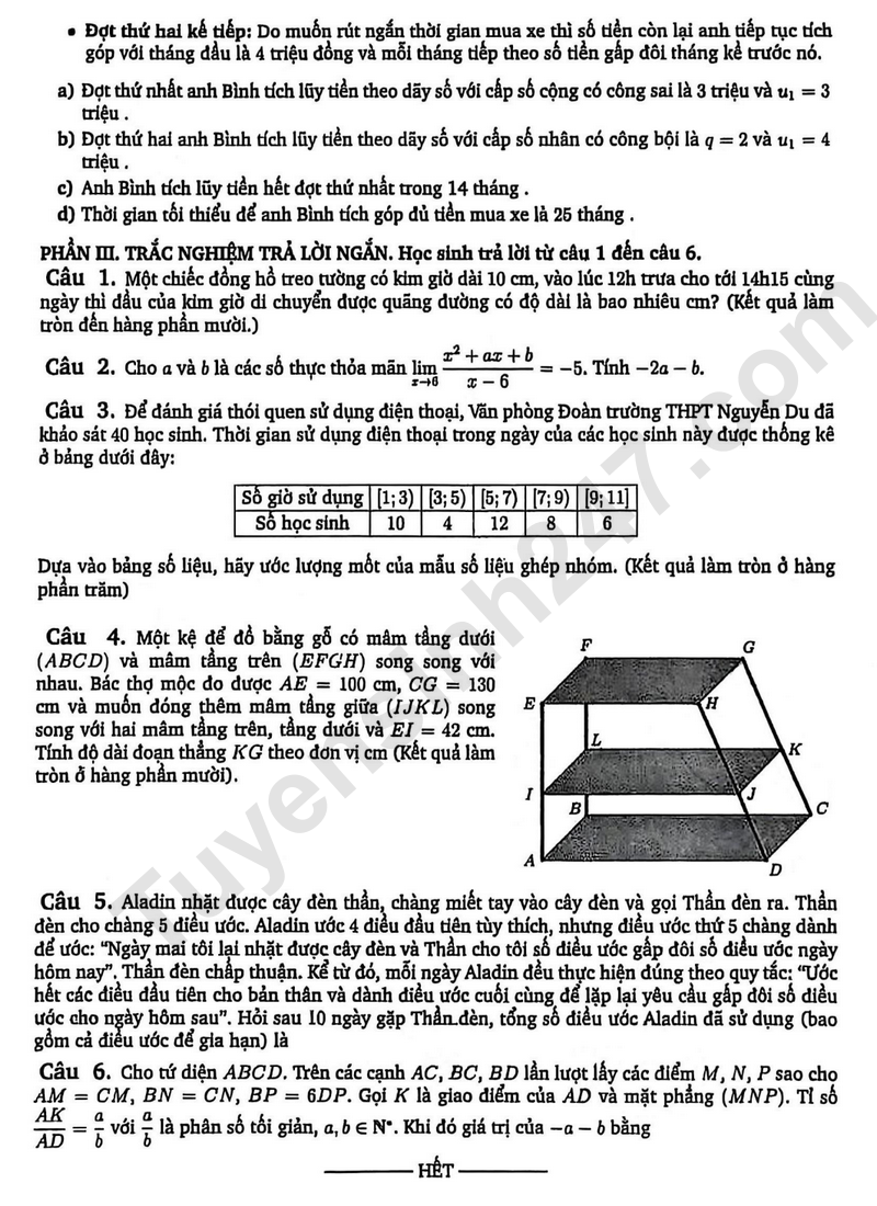Câu 5. Aladin nhặt được cây đèn thẳn, chàng miết tay vào cây đèn và gọi Thần đèn ra. Thần đèn cho chàng 5 điều ước. Aladin ước 4 điều đầu tiên tùy thích, nhưng điều ước thứ 5 chàng dành để ước: “Ngày mai tôi lại nhặt được cây đèn và Thần cho tôi số điều ước gấp đôi số điều ước ngày hôm nay". Thần đèn chấp thuận. Kể từ đó, mỗi ngày Aladin đểu thực hiện đúng theo quy tắc: "Ước hết các điều đầu tiên cho bản thân và dành điều ước cuối cùng để lặp lại yêu cầu gắp đôi số điều ước cho ngày hôm sau”. Hỏi sau 10 ngày gặp Thần đèn, tổng số điều ước Aladin đã sử dụng (bao gồm cả điều ước để gia hạn)