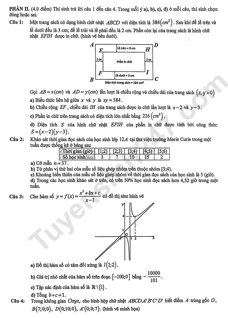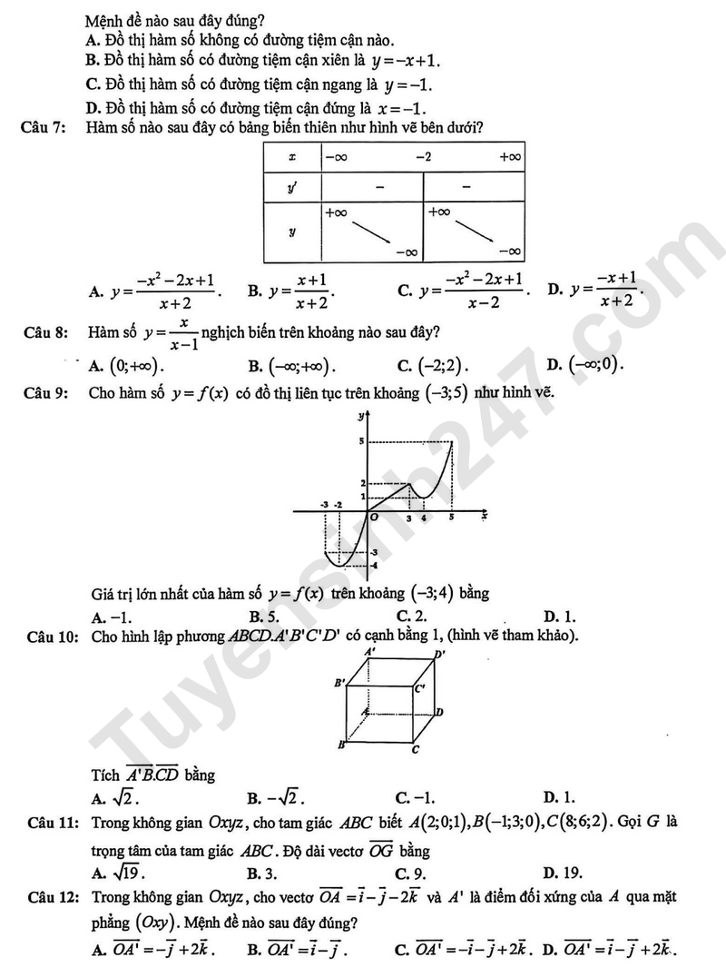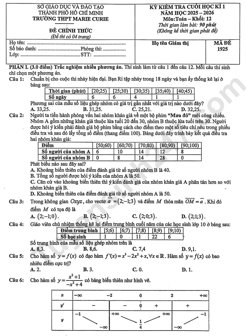 Đề thi học kì 1 môn Toán lớp 12 năm 2025 - THPT Marie Curie
