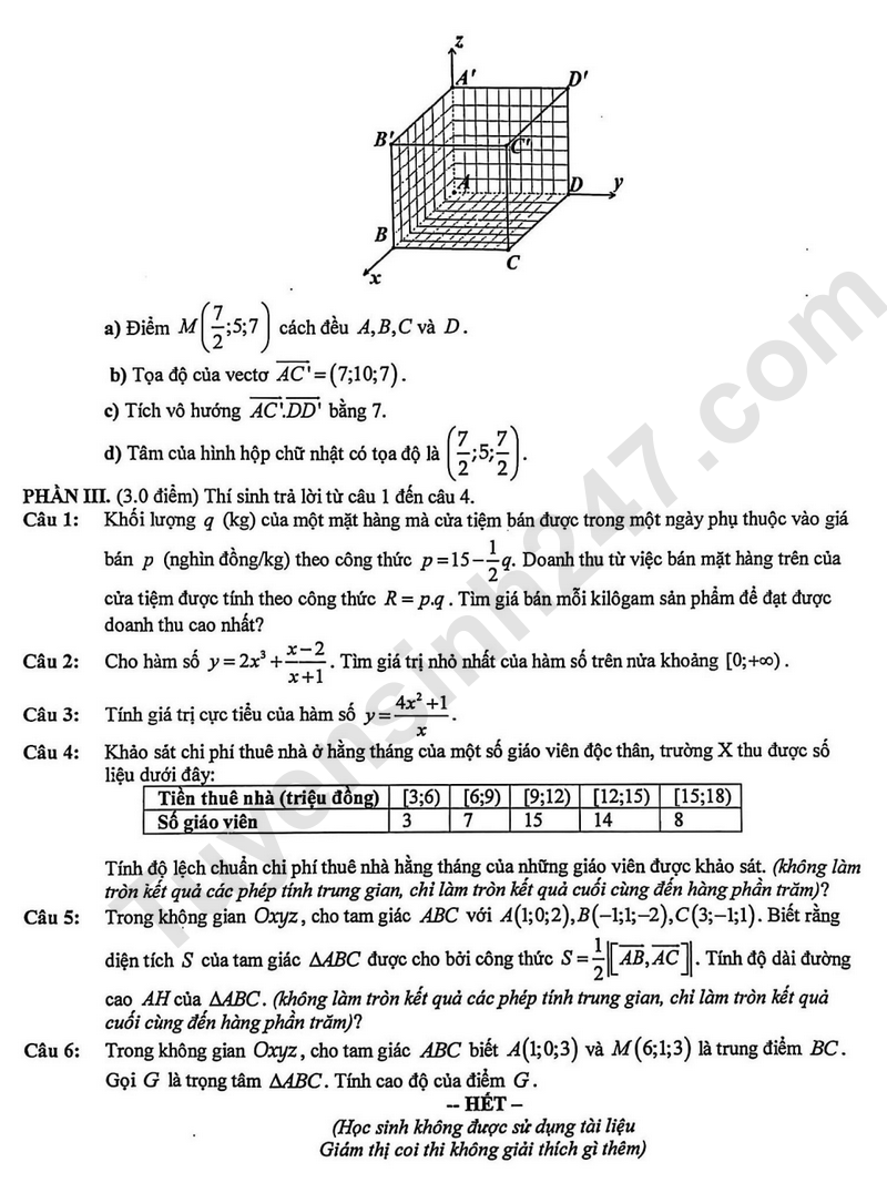 Câu 6: Trong không gian Oxyz, cho tam giác ABC biết A(1;0;3) và M(6;1;3) là trung điểm BC. Gọi G là trọng tâm AABC. Tính cao độ của điểm G.