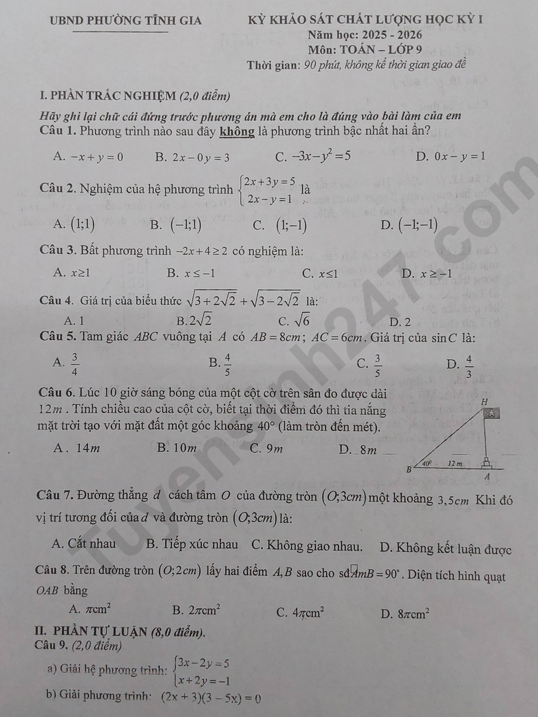 Đề thi học kì 1 môn Toán lớp 9 Phường Tĩnh Gia 2025